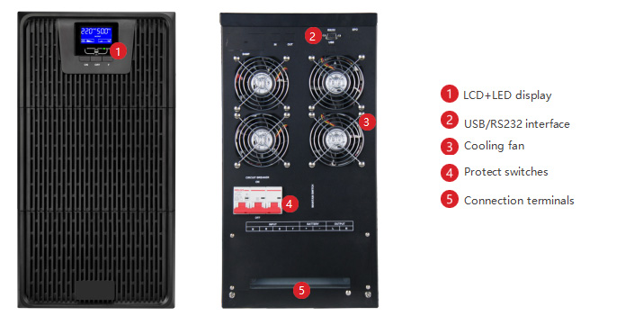 This online tower UPS provide pure sine wave power and extended running time to support critical electronics during power disruptions. It support 380V/400V/415V three phase input and 220V/230V/240V single phase output. It is iigh frequency type and high efficiency, which has complete detection and protection functions; It is true online ups with double conversion.